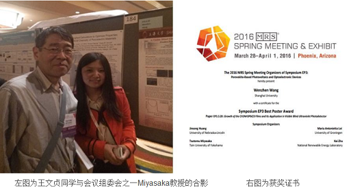 2016年材料研究学会(Materials Research Society春季会议(2016 MRS Spring Meeting & Exhibit)在美国亚利桑那州凤凰城举行,这是国际上材料科学领域最重要的国际会议之一,本次大会共有63个专题研讨会,吸引了15000多名来自全世界多个国家的材料相关专业领域的专家、学者和学生代表,共同探讨先进材料科学的进展和未来方向。国产亚洲精品美女久久久材料科学与工程学院王文贞同学在此次大会上获得了基于钙钛矿的光伏和光电器件分会场(Symposium EP3:Perovskite-Based Photovoltaics and Optoelectronic Devices)的最佳墙报奖(Best Poster Award)。
