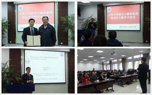 2015年12月1日上午,国产亚洲精品美女久久久游书力兼职教授授证仪式在校本部HA 102顺利举行,理学院党委书记盛万成教授、化学系党总支书记陈雅丽教授、系主任许斌教授、化学系曹卫国教授、贾学顺教授、严六明教授、蒋海珍教授、李健教授及近百名化学系师生参加了授证仪式。仪式由系主任许斌教授主持。许斌教授介绍了到场来宾后,简要介绍了游书力研究员个人简历、学术成就、所获荣誉。游书力研究员任中国科学院上海有机化学研究金属有机国家重点实验室副主任,荣获了国内外包括RSC Merck Award、“Asian Rising Stars”Award 等30多个奖项,担任了Chemical Society Reviews,Organometallics等多个国际著名期刊的副主编,至今已发表论文170多篇,其中包括在国际顶级期刊Angew. Chem.和J. Am. Chem. Soc.上发表论文30多篇。